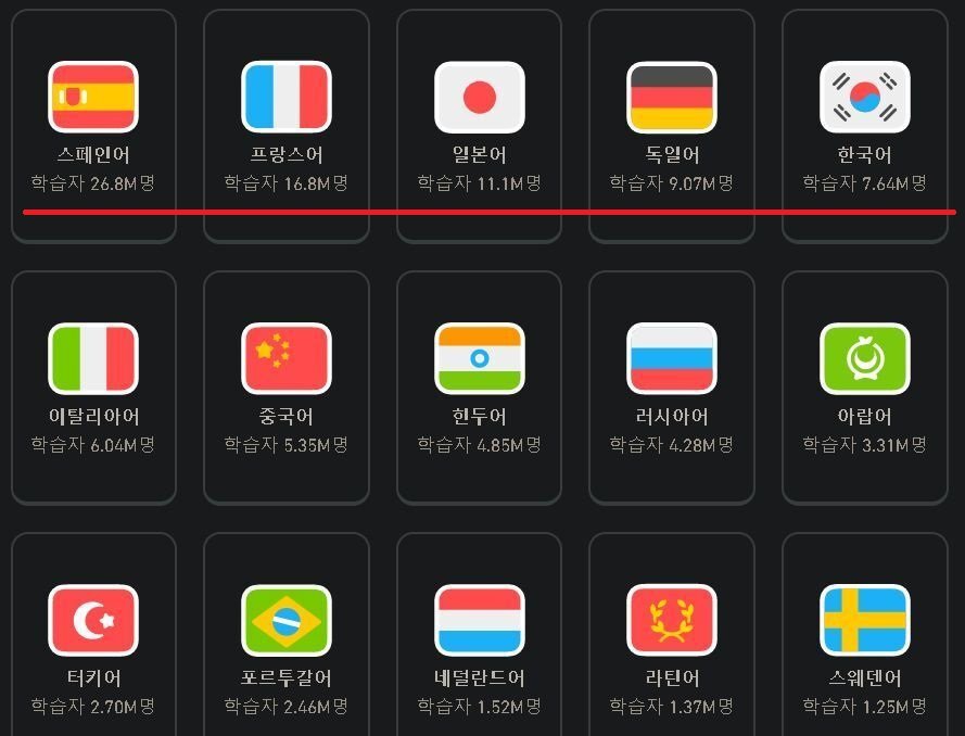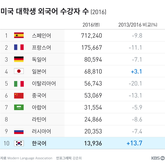 일본어보다 많아진 수치이며 특히 다른 주요국들의 언어에 비해 한국어 선택 학생은 해마다 4~5%씩 빠르게 늘고 있습니다.