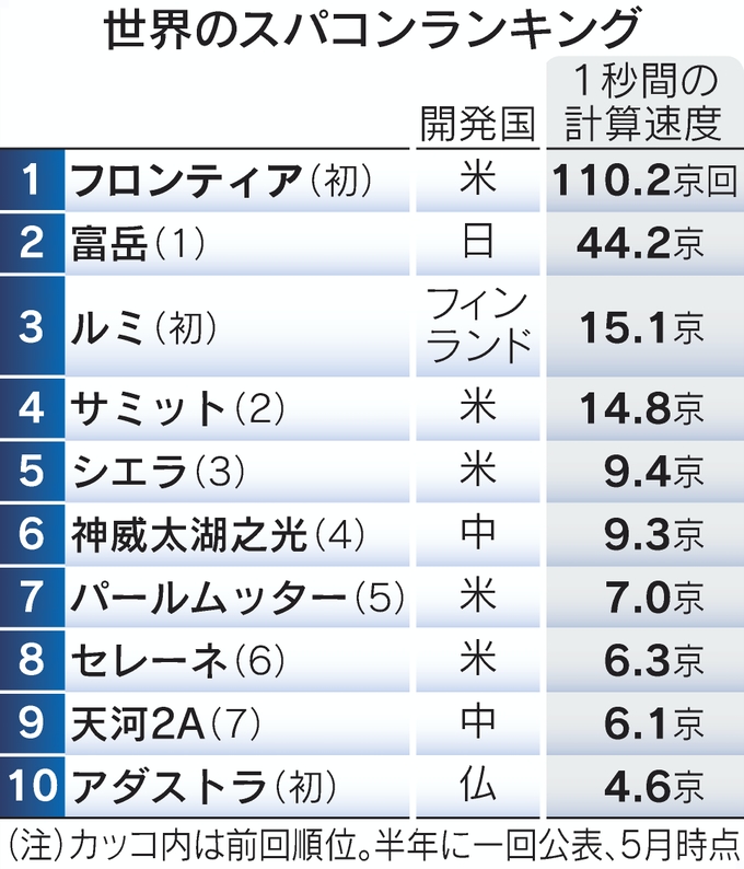 専門家の国際会議が30日、ランキングを公表した。フロンティアは1秒間に110京回(京は1兆の1万倍)の計算性能を示して1位となった。同100京回の計算ができる「エクサ級」と呼ばれる領域に足を踏み入れ、2020年6月から4期連続で首位を守ってきた2位の富岳(同44.2京回)に2倍以上の差をつけた。ランキングは半年ごとに公表する。韓国は15位ニダ。
