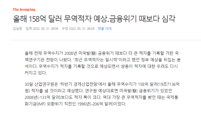 30日、産業研究院は「下半期経済産業展望」で今年の貿易収支が158億ドル(19兆7136億ウォン)の赤字を出すと予想した。 研究院の予想通りなら、米国発金融危機があった2008年(133億ドル)よりも赤字幅が大きい。 歴代最大の貿易赤字を記録したのは、国際通貨基金(IMF)通貨危機直前の1996年(206億ドル)だった。