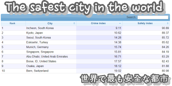세계에서 가장 안전한 도시로 1위 인천, 2위, 교토 3위, 서울, 9위가 오사카이다.