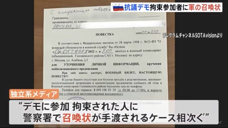 プーチン大統領が予備役の部分的動員を表明した直後から招集は始まっていて、国内では抗議デモが行われていますが、独立系メディアによりますと、デモに参加し拘束された人に対し、警察署で軍への召喚状が手渡されるケースが相次いでいるということです。