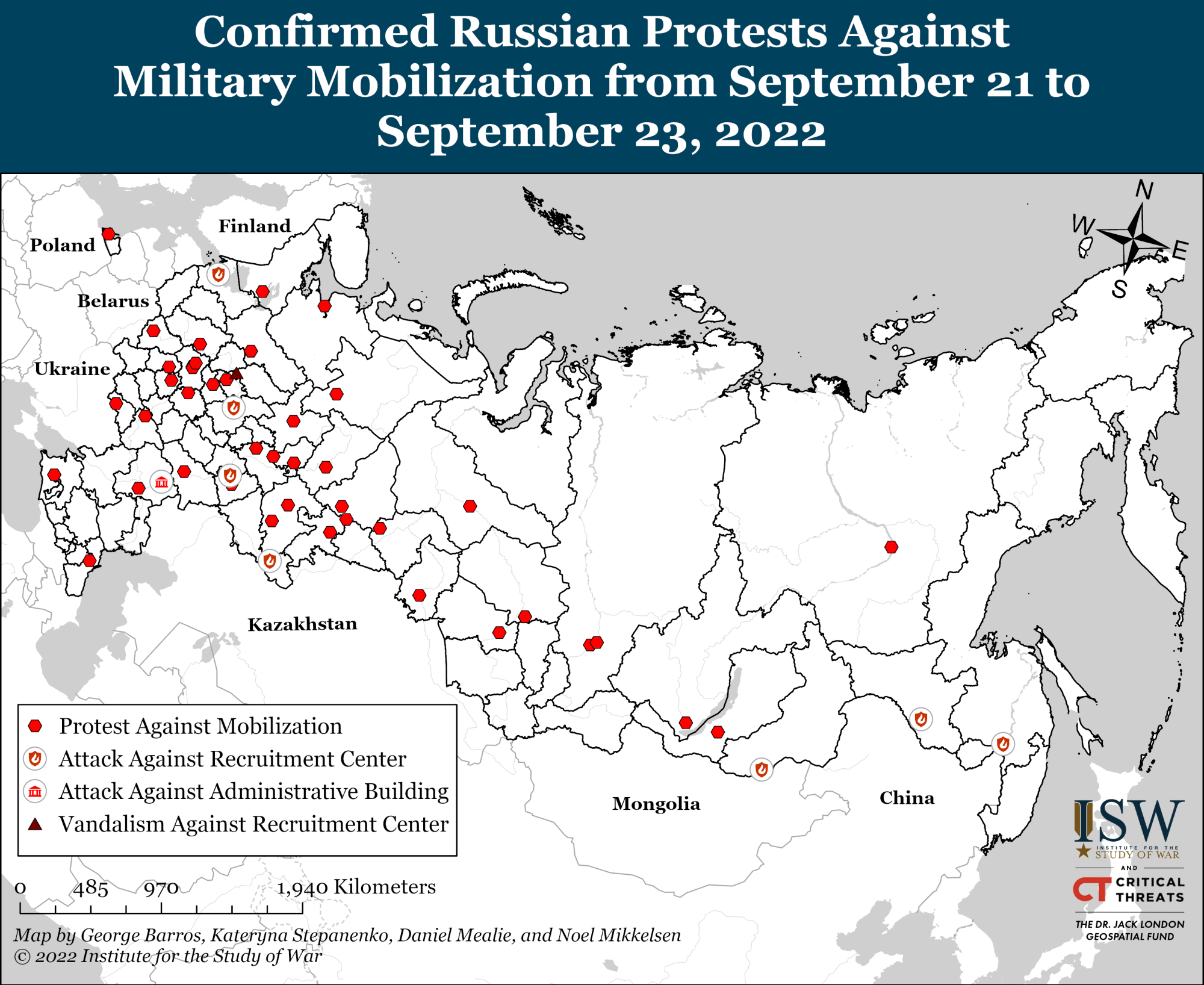プーチンは、自分が命令しさえすれば、30万人ないし120万人の部隊が忽然と誕生し、前線に送れると妄想しているようだが、今のロシアにはそれすらもできないだろう。戦争研究所が、動員抗議デモや徴兵事務所の焼討ちがあった場所の地図を公開している。