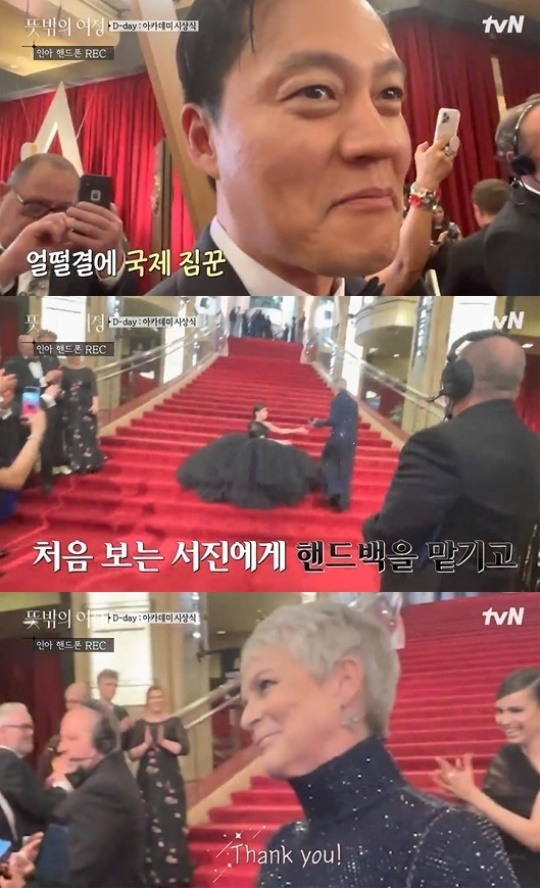 この姿を見た通訳がイ・ソジンに「いまだれのハンドバッグを持っているのか」と尋ねると、彼は「ジェイミー・リー・カーティスが私にバッグをちょっと持っててって。ところでだれだと思って私に預けて(行ったのだろうか)」と話した。