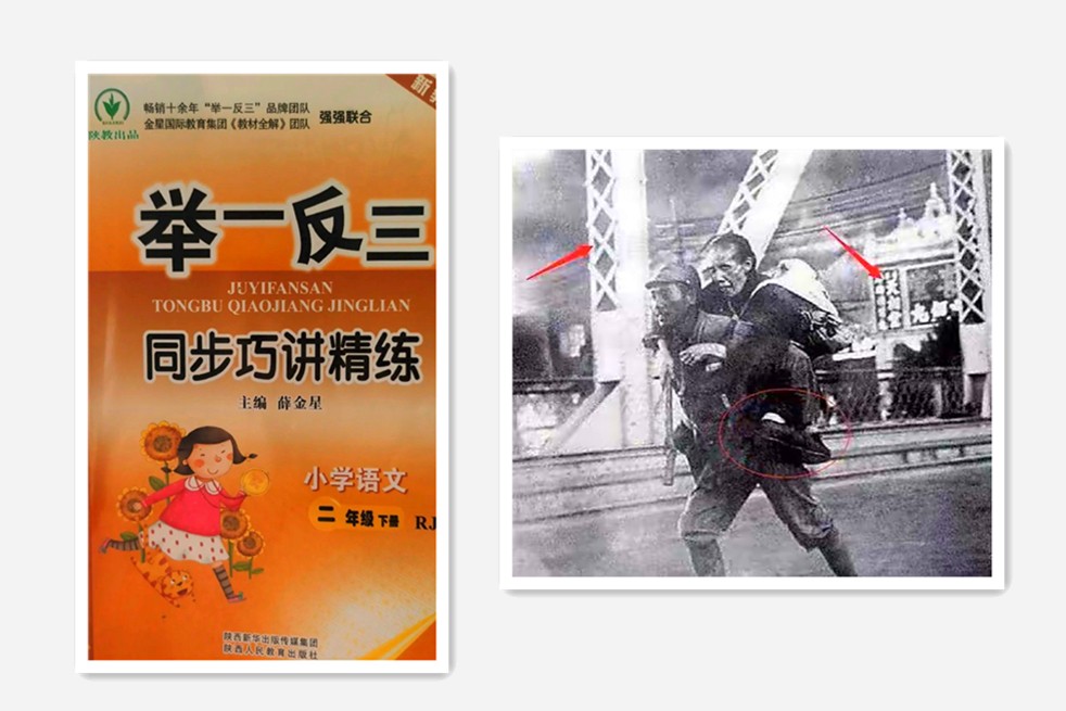 中国メディアの報道によると、問題となっているのは小学2年生向けの国語の補助教材で、写真は中国で人助けと無私の奉仕を象徴する「雷鋒」の精神を学ぶページに掲載されていた。ネットユーザーが発見し、拡散したことで物議を醸した。教材は陝西新華出版伝媒集団と陝西人民教育出版社が共同出版したもので、後者は「誤った写真を掲載した原因を調査中」と回答した。