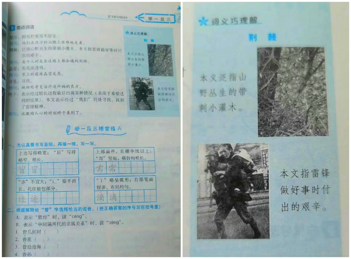 問題となっているのは小学2年生向けの国語の補助教材で、写真は中国で人助けと無私の奉仕を象徴する「雷鋒」の精神を学ぶページに掲載されていた。教材は陝西新華出版伝媒集団と陝西人民教育出版社が共同出版したものだった。
