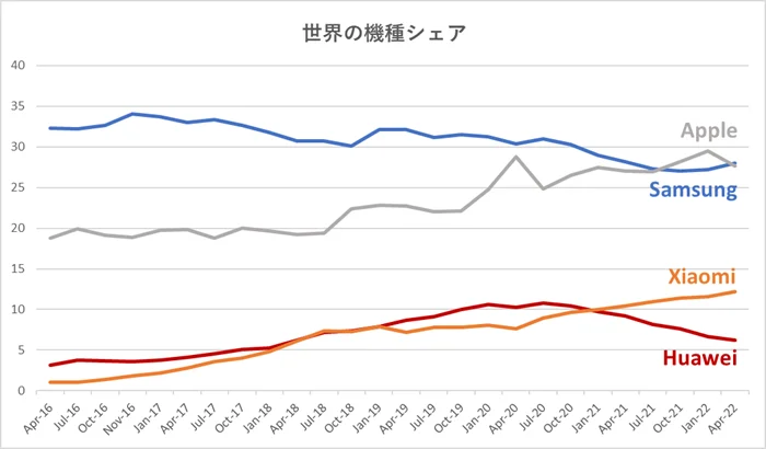 以下のグラフは、2016年4月からの世界のモバイル機種シェアの推移を表したグラフです。前回調査(2021年10月時点)では、首位をキープしてきたSamsungからAppleにトップの座が移りましたが、今回の調査ではSamsung:28.02%、Apple:27.61%とSamsungが再び巻き返す結果となりました。