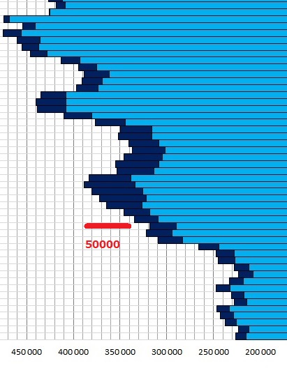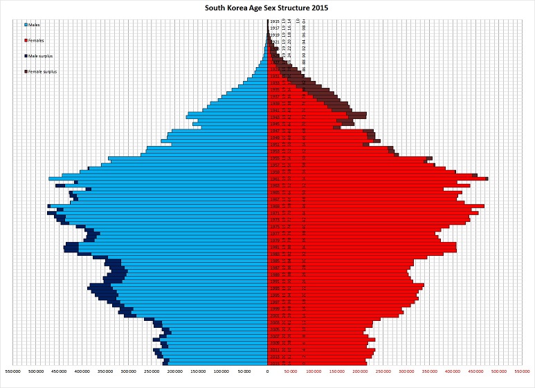 まず、韓国の人口ピラミッドを見てほしい。0歳から1歳ごとの人口を男女別にグラフにしてあるわけだけど、濃い青の部分が、(女性人口)ー(男性人口)の人数を表している。0歳児においては、少しだけ男性の方が多い。これが年齢が上がるにしたがって、差が縮まってきて、50歳辺りでほぼ同数になって、60歳を超えると明らかに女性の方が多くなっていく。これは、ほぼ世界共通の傾向で、女性の方が長生きすることによって起きる現象だ。