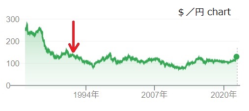 ドル・円チャートを見てもらえば判りますが、日本経済でバブル崩壊して株式価格が急落した後も、実はまだ円高が進行していたんです。
