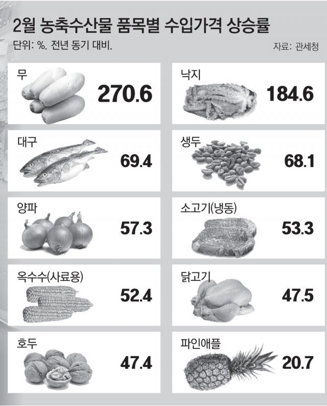 特に、畜産物や加工食品の価格が高騰して、生活物価を引き上げた。世界的な穀倉地帯に挙げられるロシアとウクライナの戦争が長引くうえ、主要穀物生産国の輸出制限まで重なった影響が大きかった。飼料用穀物価格が上昇し、畜産物は1年前より12.1%上昇した。特に輸入牛肉(27.9%)や豚肉(20.7%)、鶏肉(16.1%)などの上昇傾向が大きかった。食材費の上昇が値上げにつながり、麺(33.2%)や食用油(22.7%)、ラーメン(9.8%)など、加工食品も上昇幅が拡大した。
