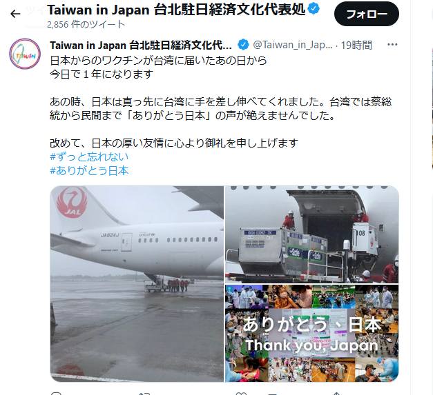 蔡氏は「1年前の今日、台湾が新型コロナウイルスとの戦いで多くの困難に直面する中、日本政府からワクチンを贈っていただきました」とし「この時のご厚意は私たちの心に深く刻み込まれています」と述べた。