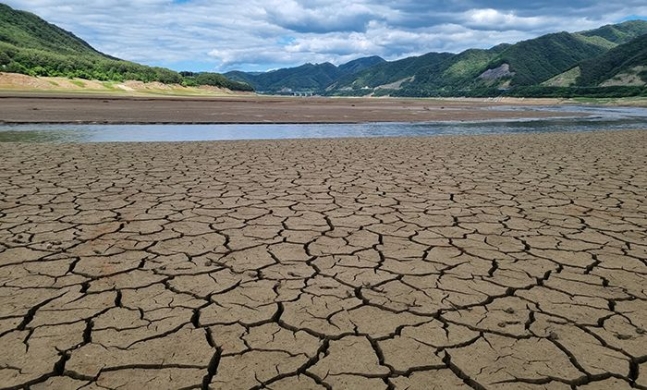 【NEWSIS】7日午後、京畿道竜仁市内の二東貯水池。続く干ばつと農繁期の農業用水利用増加で水が底を突いた。6日に久しぶりに雨が降ったものの、恵みの雨となるには遠く及ばない量だった。首都圏地域は最近6カ月間の累計降水量が151.3ミリメートルと平年の55.3%にとどまり、干ばつが続いている。