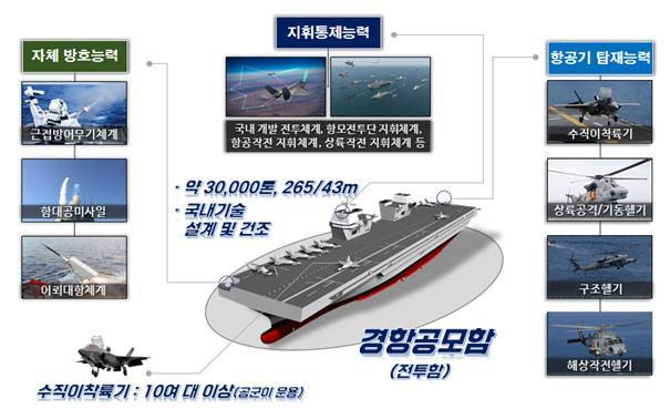 元々、韓国が共産主義陣営から攻撃された場合、貴重な反撃手段が韓国海軍海兵隊であるのに、韓国海軍の海上輸送能力や揚陸能力が不足しているために、韓国海軍海兵隊の十全な戦力発揮が不可能という問題があり、この問題への対策として韓国には「新型揚陸艦調達計画」があった。しかし、共産主義陣営に加入することを熱望している韓国人は、パク・クネを弾劾してまでムン・ジェインを韓国大統領にすえ、「新型揚陸艦調達計画」を「軽空母建造計画」に変更し、韓国海軍海兵隊が将来にわたって十全な能力発揮が出来ない状態が継続するようにして、韓国人の共産主義陣営に対する忠誠心を示した。