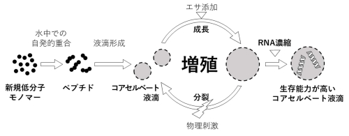 韓国人の反応小分子をエサとして増殖するコアセルベート液滴は、生物の先祖がどのように増殖能力を獲得したのかという生命起源における100年間の未解決問題を世界で初めて解決した成果です(図1)。