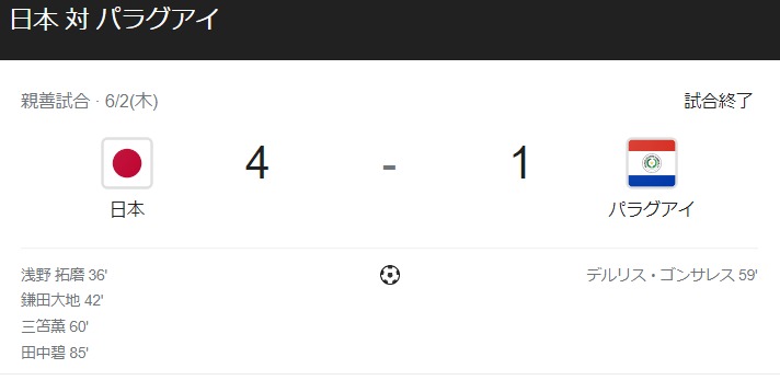 日本は6月2日のパラグアイ戦で4-1で勝利しています