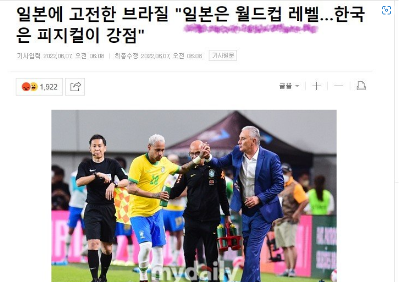 "한국은 브라질 상대로 한 골 넣었다. 8강 힘들다" 日 레전드