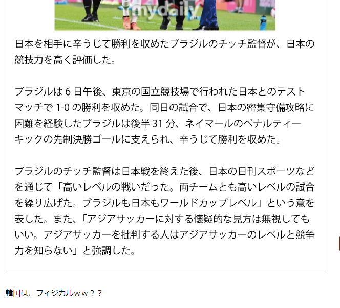 ただ、ブラジルの監督は日本を意識した発言をしているし、嘘か誠か知らんけど韓国サッカー協会とやらが出した条件がガチなら、とてもこの話題は話したくなくなるはずなんだけど、韓国人は違うのだろうな。