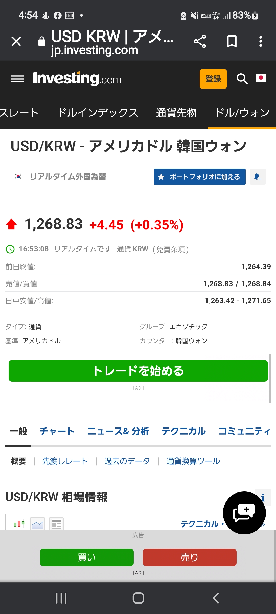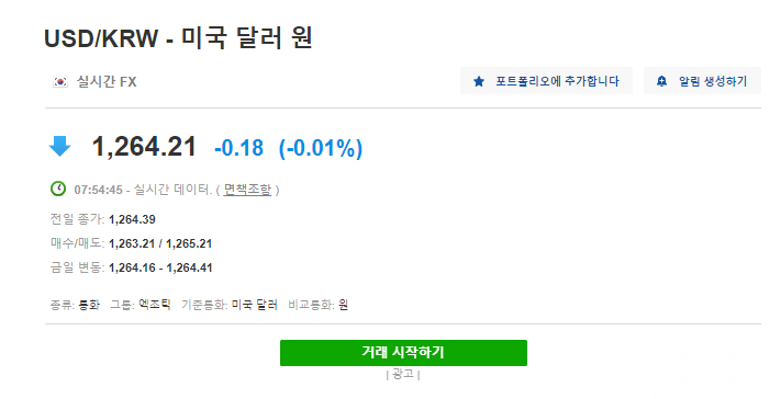 1ドル= 1,264.21 大韓民国ウォン
