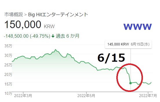 6/14 に「BANGTANTV」チャンネルにupされたこの動画によって、BTSがグループとして活動休止に入ることが判明した翌日に、株価の暴落が生じたわけです。