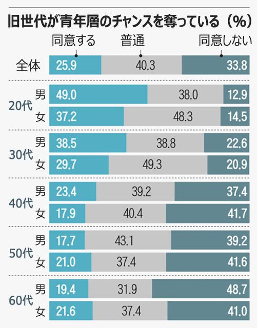 朝鮮日報とソウル大学社会発展研究所の調査によると、20代の43.4%は「旧世代が若い世代のチャンスを奪っている」と答えた。これは34.3%の30代より9.1ポイント、50代(19.3%)より24.1ポイントそれぞれ高い。同じ20代でも、男性(49.0%)の方が女性(37.2%)よりも剥奪感が大きいことが分かった。