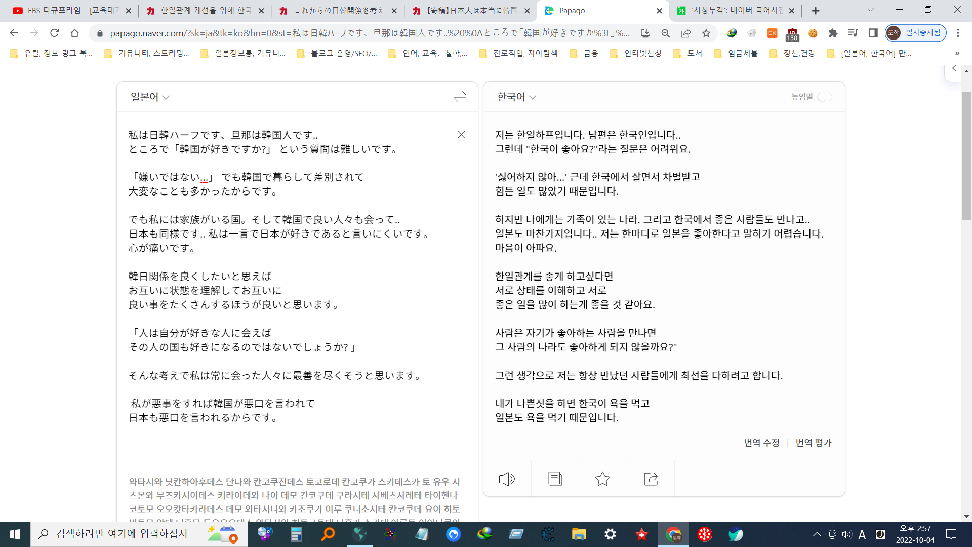私は日韓ハーフです、旦那は韓国人です.. ところで韓国が好きですか? という質問は難しいです。嫌いではない... でも韓国で暮らして差別されて大変なことも多かったからです。でも私には家族がいる国。そして韓国で良い人々も会って.. 日本も同様です.. 私は一言で日本が好きであると言いにくいです。心が痛いです。