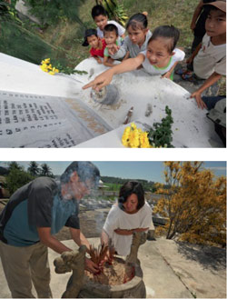민간인학살 희생자 위령비를 가리키는 베트남 아이들(맨 위). 위령비에 헌화하는 구수정 박사(위 오른쪽). 마을에는 ‘한국군 증오비’가 서 있었다. 증오비에는 이렇게 새겨져 있다. “하늘에 닿을 죄악, 만대를 기억하리라! 이 학살에서 희생된 자의 수가 총 430명이며, 그중 268명은 여성, 109명은 50세에서 80세까지 노인, 82명은 어린이, 7명은 임신부였다. 2명은 산 채로 불에 던져졌으며, 1명은 목이 잘렸고, 1명은 배가 갈라졌으며, 2명은 강간을 당했다. 2가구는 한 명도 남김없이 몰살당했다.”