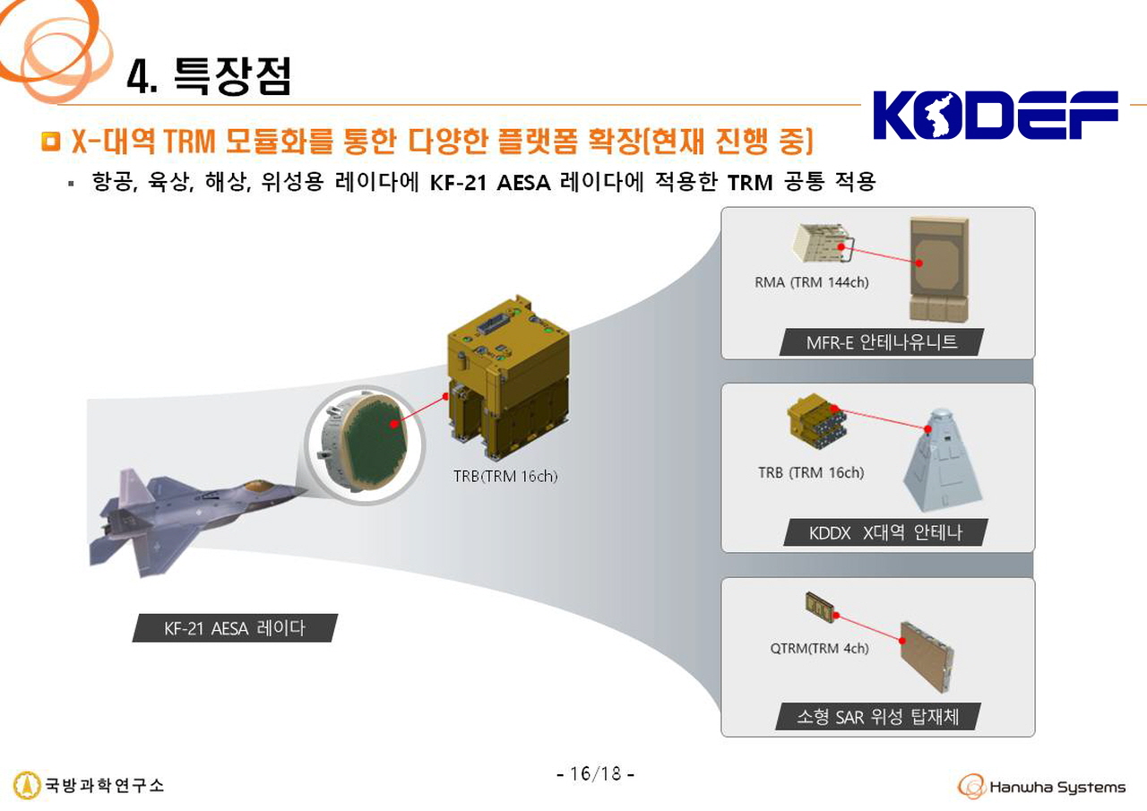 본 구조 덕분에 유지 보수성이 우수함은 물론, TRM을 마치 레고블록처럼 결합하는 형태로 얼마든지 다양한 크기와 출력의 AESA 레이더를 개발할 수 있습니다.