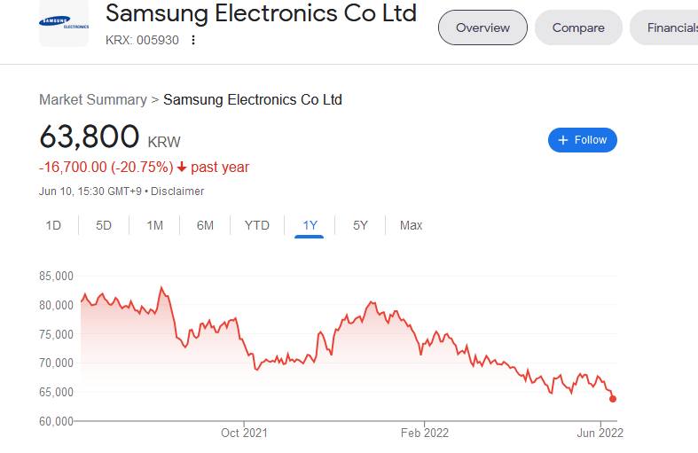 11日、韓国取引所によると、10日、サムスン電子は前取引日より1400ウォン(2.15%)下げた6万3800ウォンで取引を終えた。去る4月28日(章中低価格6万4500ウォン)以後6週間で52週の新低価格をまた記録した。