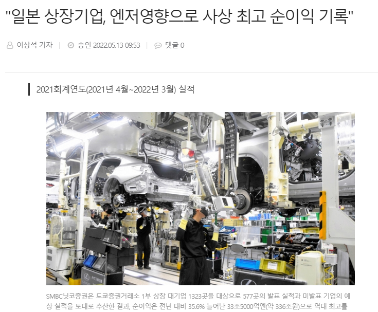 SMBC日興証券は東京証券取引所1部上場大企業1323社を対象に577社の発表実績と未発表企業の予想実績を土台に推算した結果、純利益は前年対比35.6%増の33兆5000億円(約336兆ウォン)で歴代最高を記録するものと予想された。 従来の最高純利益は2017会計年度の30兆円だった。