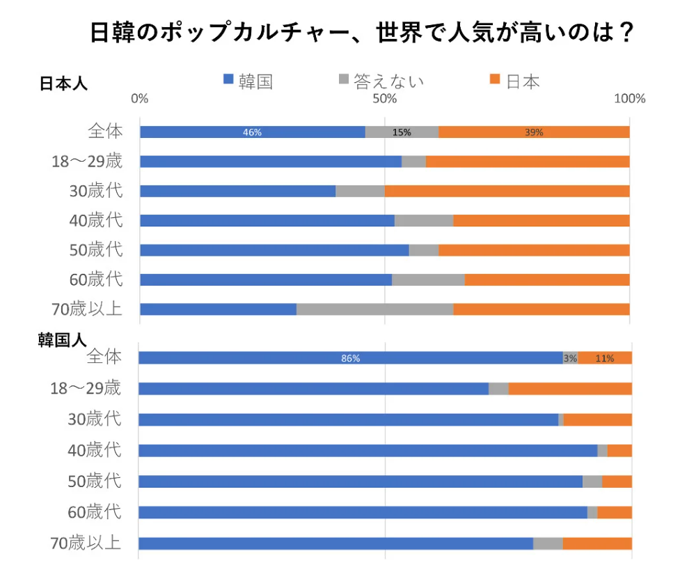ただの意識調査でしょ、単純に韓国人は自己評価が高いねとしか思わんよ。韓国の70代以上がJ-POP、K-POPを把握してる訳ないし。日本全体で見たらほぼ半々。