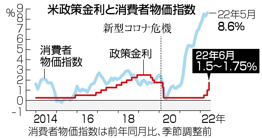 1994年以来の大幅利上げとなる。米連邦準備制度理事会(FRB)のパウエル議長は、7月の会合でも大幅利上げに動くことを示唆。予想外に激しいインフレ高進を抑えるべく、強力な措置を講じる姿勢を明確にした。