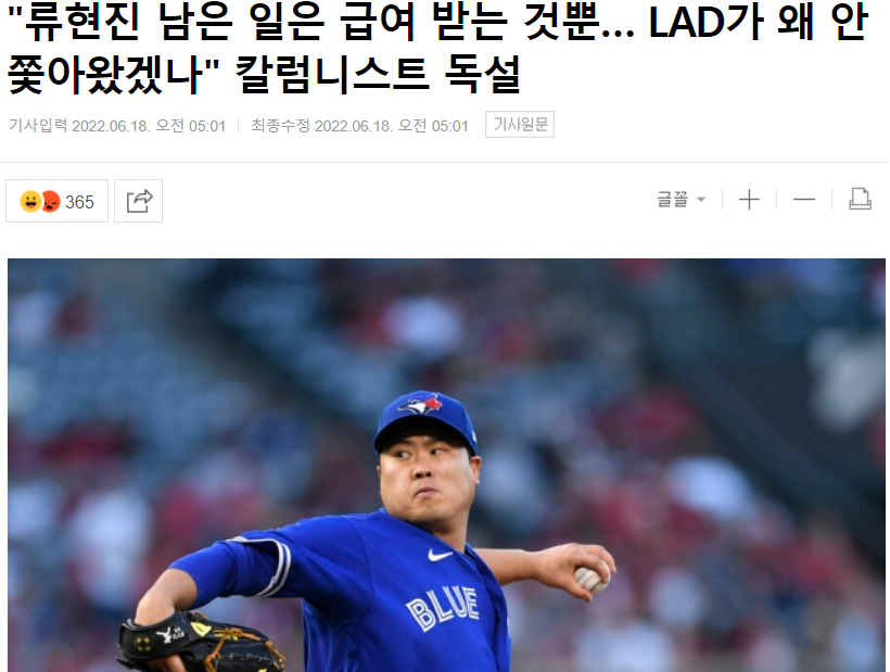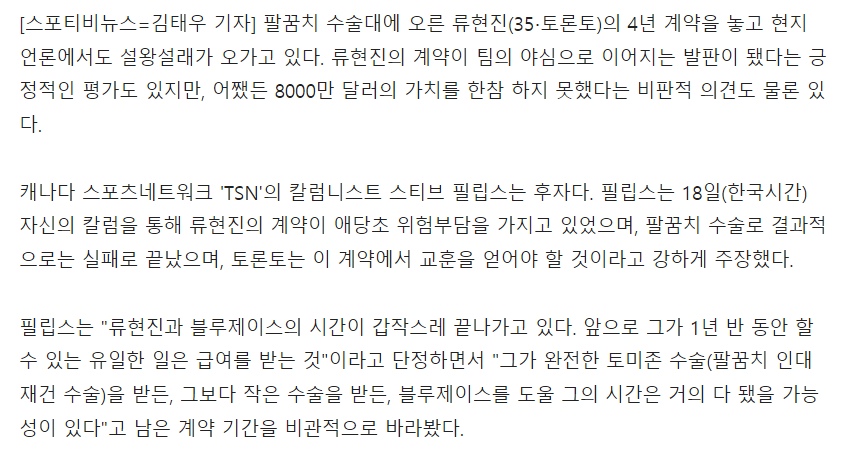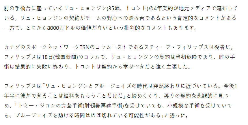 フィリップスは「リュ·ヒョンジンとブルージェイズの時間が突然終わっている。 今後、彼が1年半の間にできる唯一のことは給与を受け取ること」と断定し、「彼が完全なトミーゾーン手術(肘靭帯再建手術)を受けるか、それより小さな手術を受けるか、ブルージェイズを助ける彼の時間はほとんど過ぎた可能性がある」と残りの契約期間を悲観的に見通した。>>40