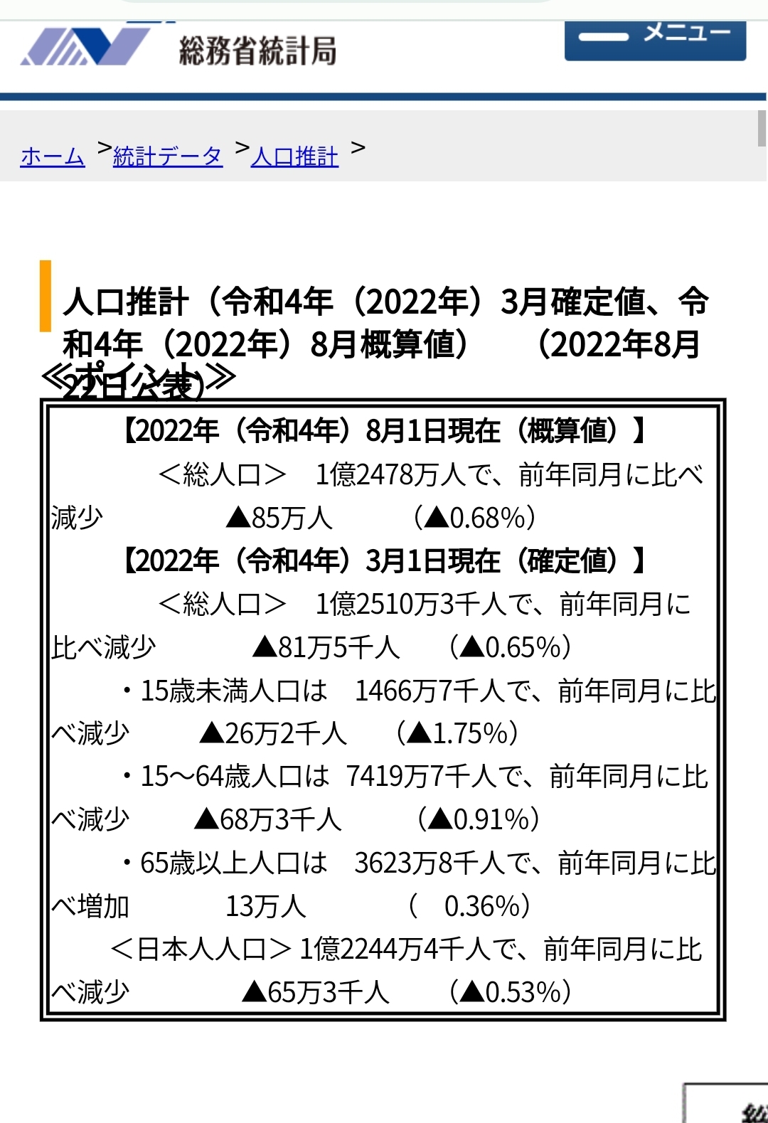 令和4年現在,統計局は2017年人口を基準にし,(出生者数-死亡者数+社会的増減)で推計しています。だが,日本は行政の電算化が不備なので,戦前の人口数や大本営時代の人口数をしっかり把握していません。その点で,人口数が過大評価されている可能性もあります。