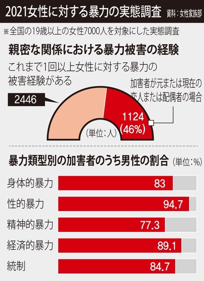 デートDVの被害実態を見ると、女性に対する暴力被害を一度以上経験した女性(2446人)のうち、当時付き合っていた人や過去に付き合っていた人から暴力被害に遭った割合は14.3%(350人)と確認された。デートDVの加害者が最も多く行った暴力(複数回答)は性的暴力(43.2%)で、身体的暴力(37.8%)と精神的暴力(36.4%)も多かった。