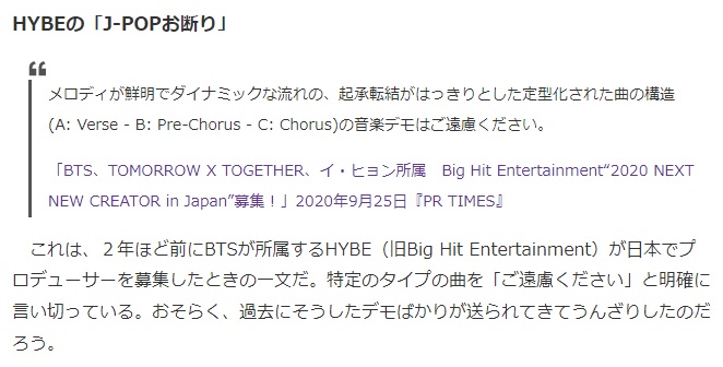 bts사무소 일본인 프로듀서 모집 요항, jpop 스타일의 낡은 곡조 방식은 거절한국 작곡가 방식