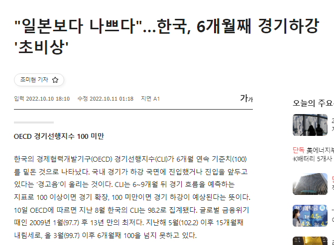 特に、韓国の8月CLIはOECD平均(98.9)より低かった。 国別に見ると、米国(98.8)、日本(100.5)、欧州連合(98.6)など主要先進国より低い。 主要国のうち、韓国よりCLIが悪い国は中国(98.0)程度だ。>>30