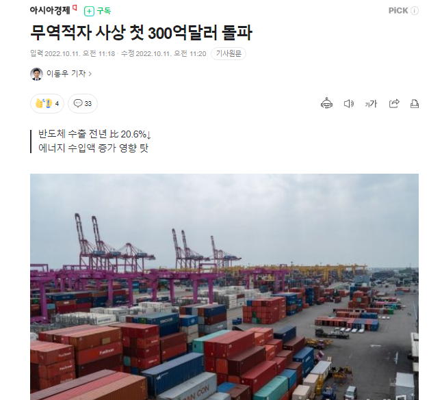 今月10日まで貿易赤字が続き、今年の累積貿易赤字が史上初めて300億ドルを超えた。グローバル景気鈍化が本格化し、韓国経済の支えである半導体など主力品目の輸出が減り、エネルギー輸入額が増加した影響が大きかった。