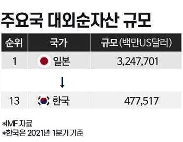 https://www.hankyung.com/finance/article/2019093044391 海外投資利子・配当などの所得、韓国は、日本の2%水準にとどまる。 日本の年金基金、金融会社などが、昨年一年間で海外で稼いだ投資所得(配当利子所得)は2971億ドル(約358兆ウォン)だ。 日本の、海外金融投資を通じた収入から、支出を引いた投資所得収支(純投資所得)は、実に1899億ドル(約229兆ウォン)に達した。