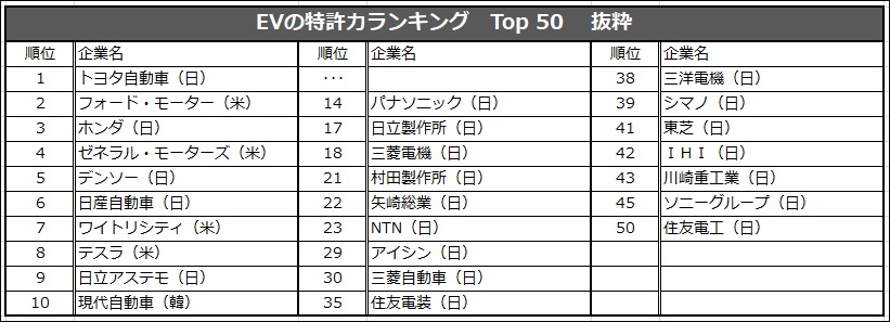 2021年のEVの特許ランキングでは、TOP10にはトヨタを筆頭に5社、TOP50には21社の日本メーカーが入っている。