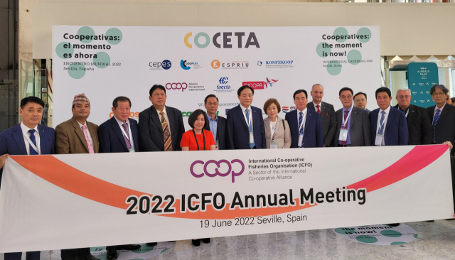 国際協同組合同盟(ICA)水産委員会のイム・ジュンテク委員長(左から7番目)がスペイン・セビーリャで開かれるICA水産委員会に参加して水産業の発展のために全世界の水産協同組合員の共同対応を呼びかける声明書を発表した。[写真水 産協同組合中央会提供]