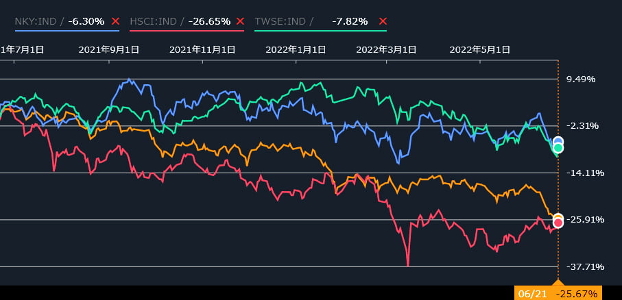 KOSPIは直近1年間で「-25.91%」とひどい下落ですが、しかし「アジアで一番ひどい」とはなっていません。香港のHSCIは「-26.65%」とさらに悪いので。