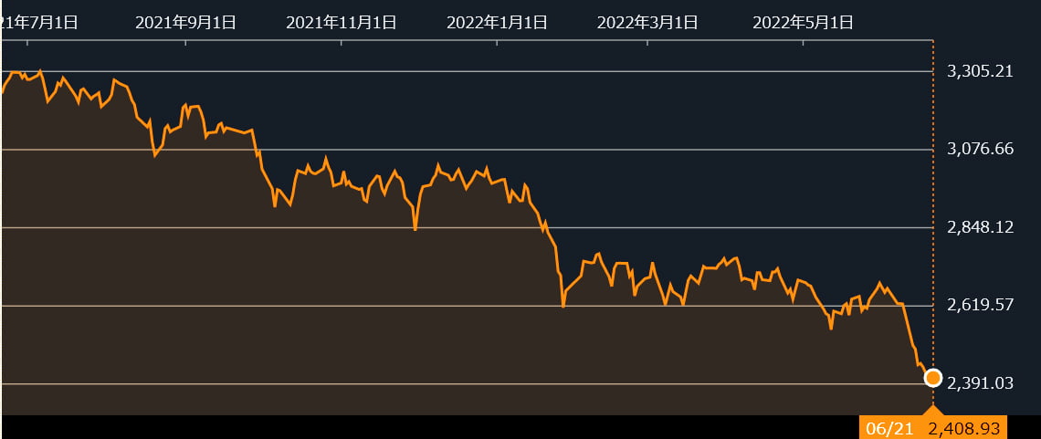 まずKOSPIを『Bloomberg』で見てみます(2022年06月22日13:09現在)。