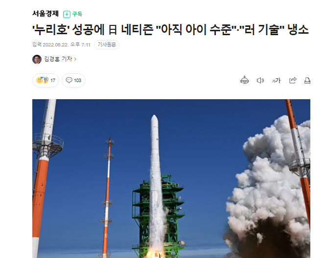 記事は、韓国で昨年10月に打ち上げに失敗し、今月に入ってさらに2度の発射延期に見舞われた自主開発ロケット「ヌリ号」が21日午後4時、ついに打ち上げに成功したと紹介。打ち上げ成功の情報が流れた瞬間、韓国メディアが「興奮」したと伝えた。