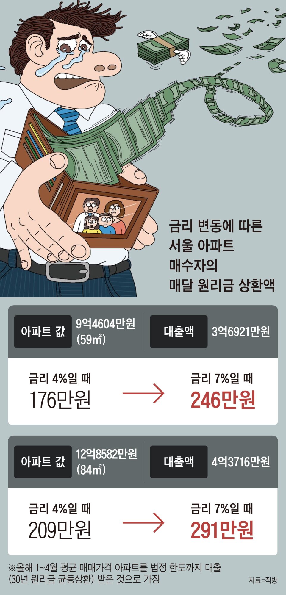 金利が8%になった場合4%の倍なので元金返済振り当て分は変わらず利息だけが増え支払いは100~120万ウォン増える