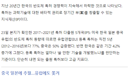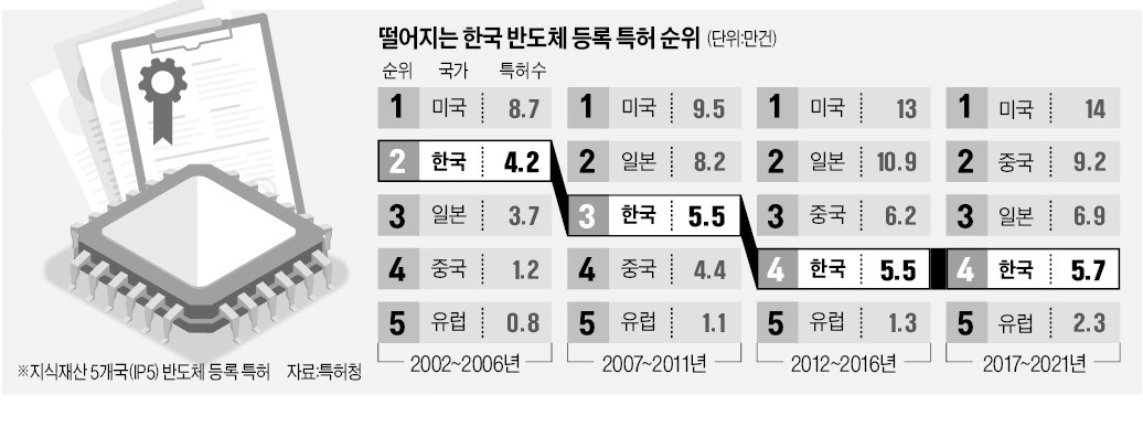 23日、本紙が確認した2017~2021年特許多出願5カ国(IP5:米国、韓国、日本、中国、欧州)の半導体特許動向によると、欧州連合(EU)登録特許は直前5年(2012~2016年)より77%、中国は50%急増した。 一方、韓国は同期間4.2%増に止まった。 登録特許はどれだけ「使える」技術を開発したかを判断する基準だ。 単純に出せばいい出願特許より高級指標だ。