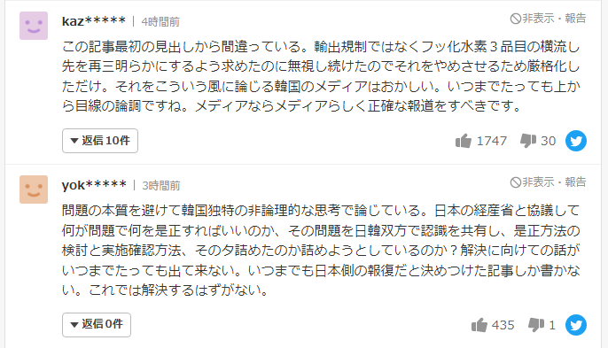 この記事最初の見出しから間違っている。輸出規制ではなくフッ化水素3品目の横流し先を再三明らかにするよう求めたのに無視し続けたのでそれをやめさせるため厳格化しただけ。それをこういう風に論じる韓国のメディアはおかしい。いつまでたっても上から目線の論調ですね。メディアならメディアらしく正確な報道をすべきです。