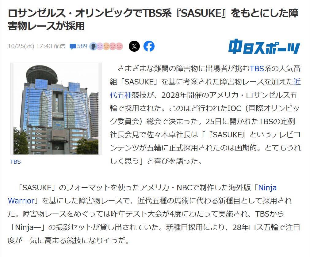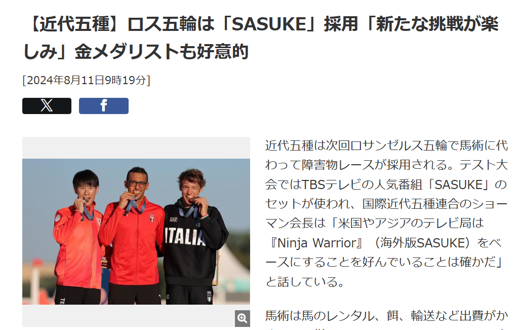 「SASUKE」のフォーマットを使ったアメリカ・NBCで制作した海外版「Ninja Warrior」を基にした障害物レースで、近代五種の馬術に代わる新種目として採用された。障害物レースをめぐっては昨年テスト大会が4度にわたって実施され、TBSから「Ninja―」の撮影セットが貸し出されていた。新種目採用により、28年ロス五輪で注目度が一気に高まる競技になりそうだ。