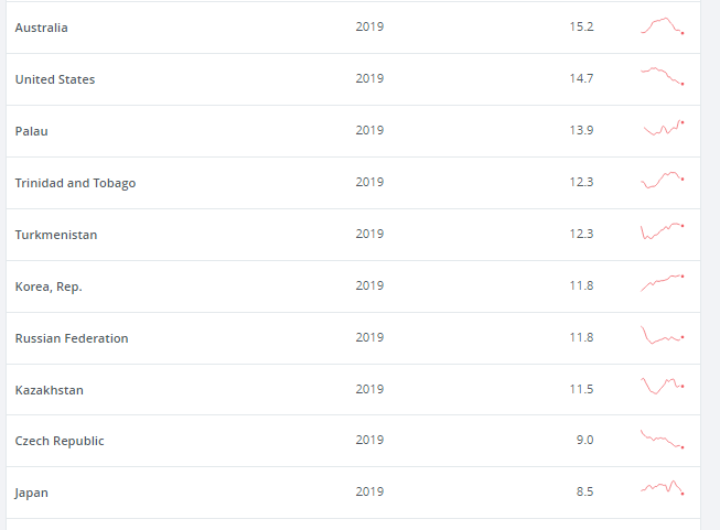 ★THE WORLD BANK 一人当たりのCo2排出量による国のリスト