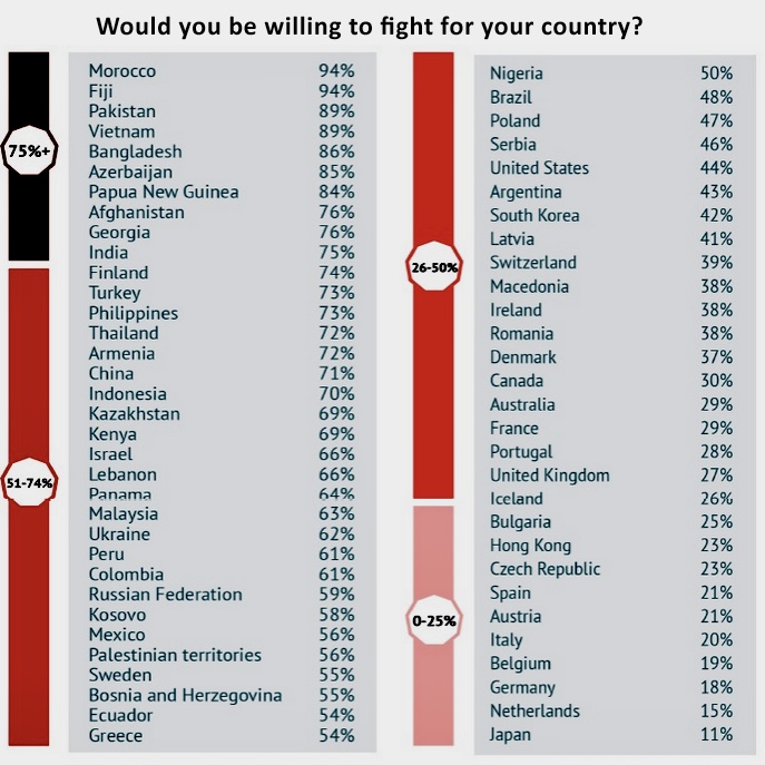 8名無し2022/07/04(Mon) 18:09:59ID:gyODc5MzY(1/1)NG報告愛する人や国のために戦う意志がある日本人男性の割合↓11%と、世界最下位となってしまう愛する人も愛国心も無い謎の存在に>>36>>76>>1630