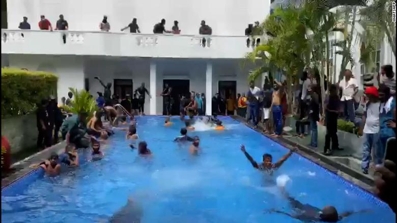 同国のテレビやSNSで流れた動画には、デモ隊が警戒線を突破して公邸に乱入し、バルコニーから横断幕を掲げたり、敷地内のプールに飛び込んだりする場面が映っている。治安当局者によると、本人はこの時すでに別の場所へ移っていた。