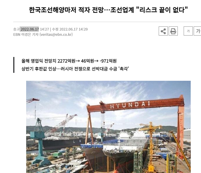 今年、国内大手造船3社(韓国造船海洋·大宇造船海洋·三星重工業)の中で唯一黒字が見込まれていた韓国造船海洋まで赤字を出すものと予想される。 昨年に続き、上半期の厚板価格が再び上昇し、追加引当金設定が避けられない影響と分析される。 ここにロシア·ウクライナ戦争が長期化するなど予測不可能な状況が続くと造船業界ではまた別のリスクが発生するかもしれないという憂慮が出ている。
